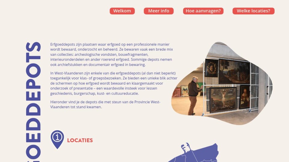 In West-Vlaanderen zijn enkele van die erfgoeddepots (al dan niet beperkt) toegankelijk voor klas- of groepsbezoeken. Ze bieden een unieke blik achter de schermen op hoe erfgoed wordt bewaard en klaargemaakt voor onderzoek of presentatie – een waardevolle insteek voor lessen geschiedenis, burgerschap, kust- en cultuureducatie.