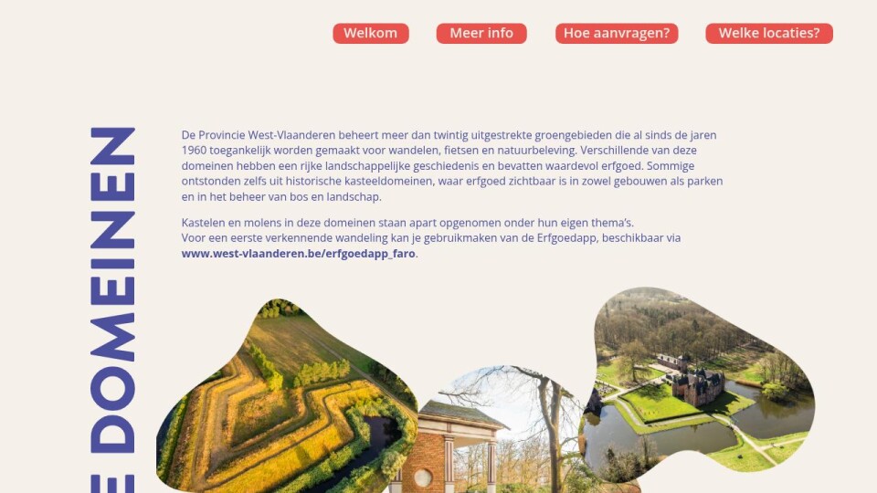 De Provincie West-Vlaanderen beheert meer dan twintig uitgestrekte groengebieden die al sinds de jaren 1960 toegankelijk worden gemaakt voor wandelen, fietsen en natuurbeleving. Verschillende van deze domeinen hebben een rijke landschappelijke geschiedenis en bevatten waardevol erfgoed. Sommige ontstonden zelfs uit historische kasteeldomeinen, waar erfgoed zichtbaar is in zowel gebouwen als parken en in het beheer van bos en landschap.