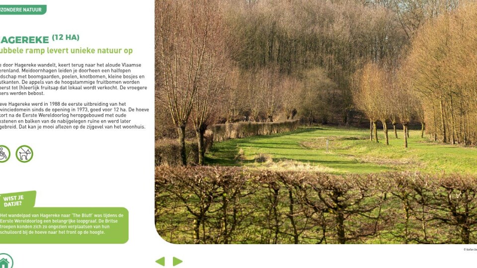 Wie door Hagereke wandelt, keert terug naar het aloude Vlaamse boerenland. Meidoornhagen leiden je doorheen een halfopen landschap met boomgaarden, poelen, knotbomen, kleine bosjes en houtkanten. De appels van de hoogstammige fruitbomen worden geperst tot (h)eerlijk fruitsap dat lokaal wordt verkocht. De vroegere akkers werden bebost.