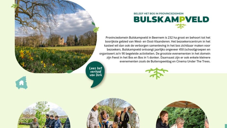 Provinciedomein Bulskampveld in Beernem is 232 ha groot en behoort tot het bosrijkste gebied van West- en Oost-Vlaanderen. Het bezoekerscentrum in het kasteel wil dan ook de verborgen samenleving in het bos zichtbaar maken voor bezoekers. Bulskampveld ontvangt jaarlijks ongeveer 450 (school)groepen en organiseert zo’n 90 begeleide activiteiten. De grootste evenementen in het domein zijn Feest in het Bos en Bos in ‘t donker. Daarnaast zijn er ook enkele kleinere evenementen zoals de Buitenspeeldag en Cinema Under The Trees.