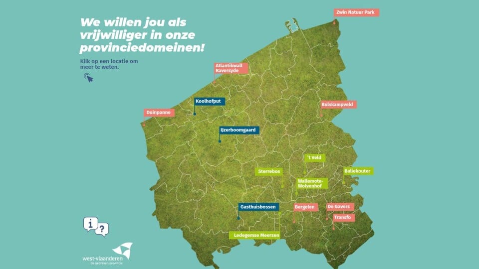 Ledegemse Meersen Wallemote-Wolvenhof ’t Veld Sterrebos Kemmelberg Palingbeek De Blankaart Transfo Baliekouter De Gavers Bergelen Gasthuisbossen Bulskampveld IJzerboomgaard Koolhofput Duinpanne Atlantikwall Raversyde Zwin Natuur Park Klik op een locatie om meer te weten. We willen jou als vrijwilliger in onze provinciedomeinen! De Gavers Transfo Baliekouter Wallemote-Wolvenhof ’t Veld Sterrebos Kemmelberg Palingbeek Bergelen Ledegemse Meersen Gasthuisbossen Bulskampveld De Blankaart IJzerboomgaard Atlantikwall Raversyde Koolhofput Duinpanne Klik op een locatie om meer te weten. We willen jou als vrijwilliger in onze provinciedomeinen! Zwin Natuur Park